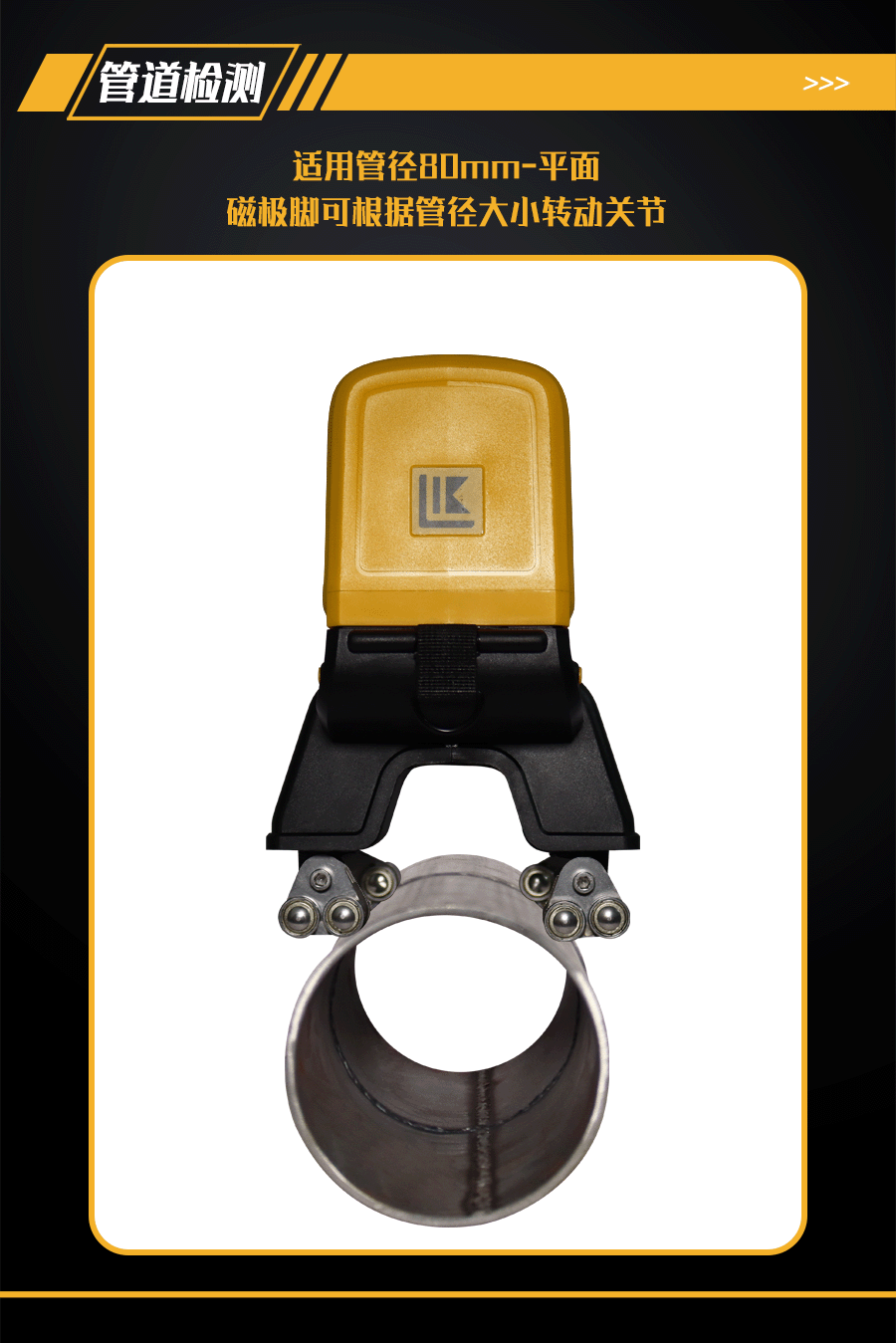 9、可檢測(cè)≥80mm以上直徑管道焊縫及平板焊縫;磁極腳為可轉(zhuǎn)動(dòng)關(guān)節(jié),可隨不同管徑的工件調(diào)節(jié)磁極角度,使磁極貼合管件弧面,保證探傷效果;配有管道焊縫、平板焊縫檢測(cè)2種規(guī)格磁極腳。