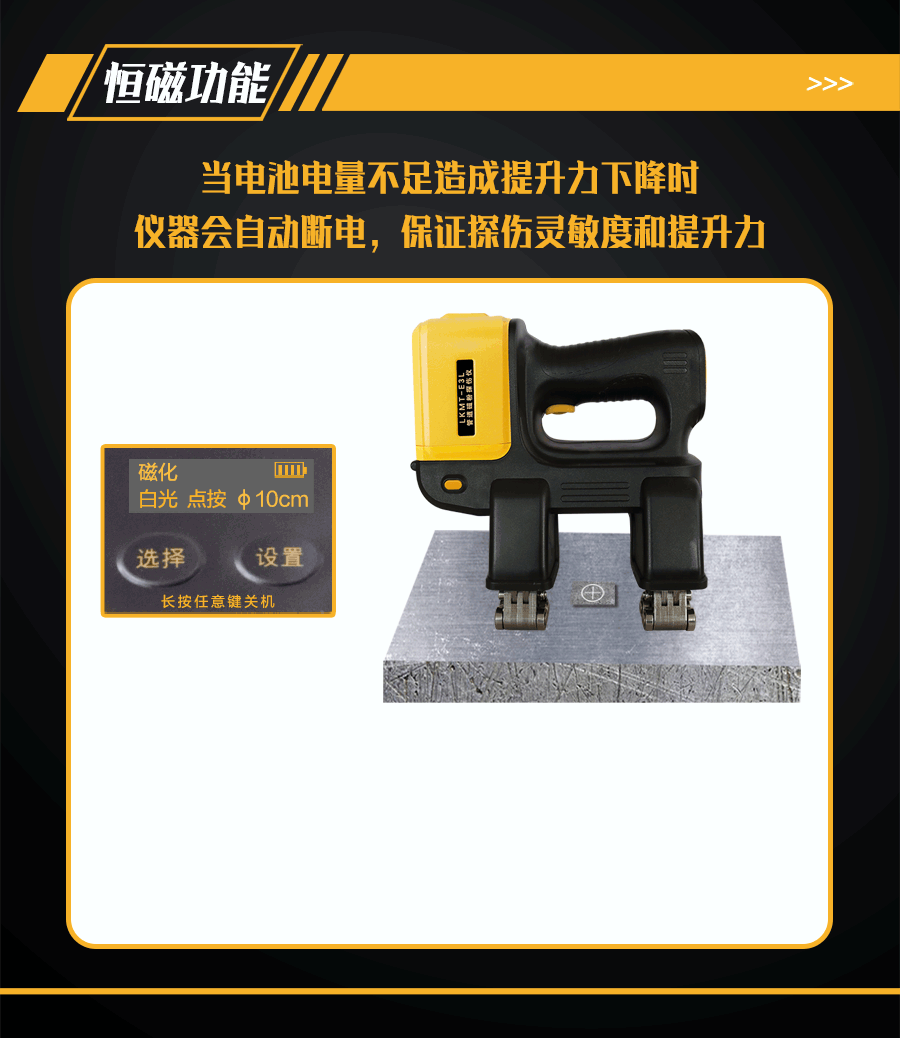 6、恒磁控制功能,因電量下降導(dǎo)致提升力不滿足探傷需求時(shí)自動(dòng)斷電,保證探傷靈敏度。
