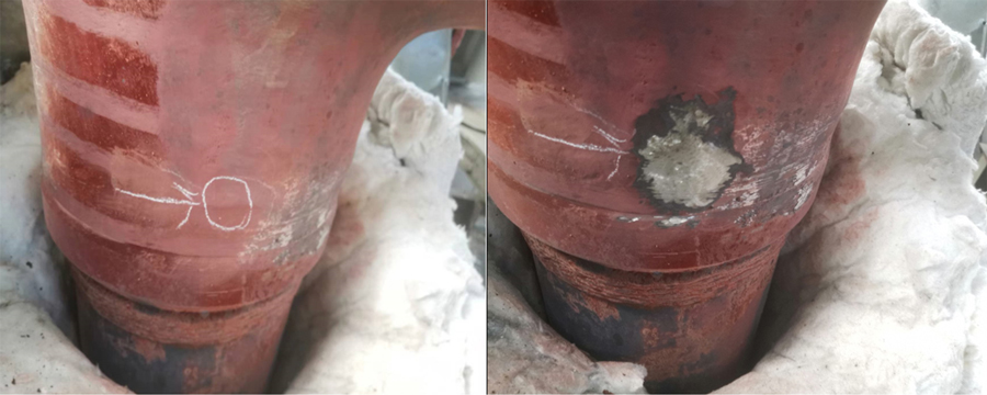 承壓容器表面銹蝕嚴重,而且溫度在200℃左右,在未停機且未打磨的狀態下進行檢測。檢測發現兩處缺陷,一處裂紋與一處氣孔,現場打磨驗證,其中一處缺陷檢測圖像如圖10所示。